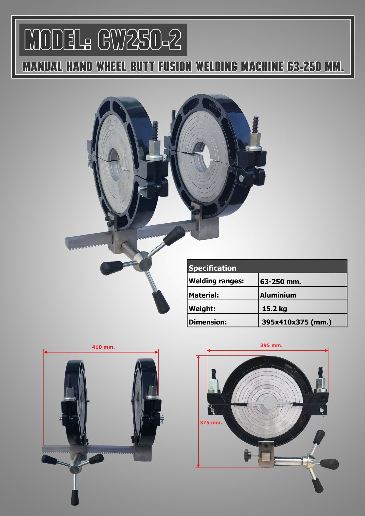 ชุดแคลมป์จับท่อเครื่องเชื่อมท่อ HDPE 250 mm. รุ่น CW250-2 แบบมือหมุน สำหรับเชื่อมท่อขนาด 63, 75, 90, 110, 125, 140, 160, 180, 200, 225, 250 mm.